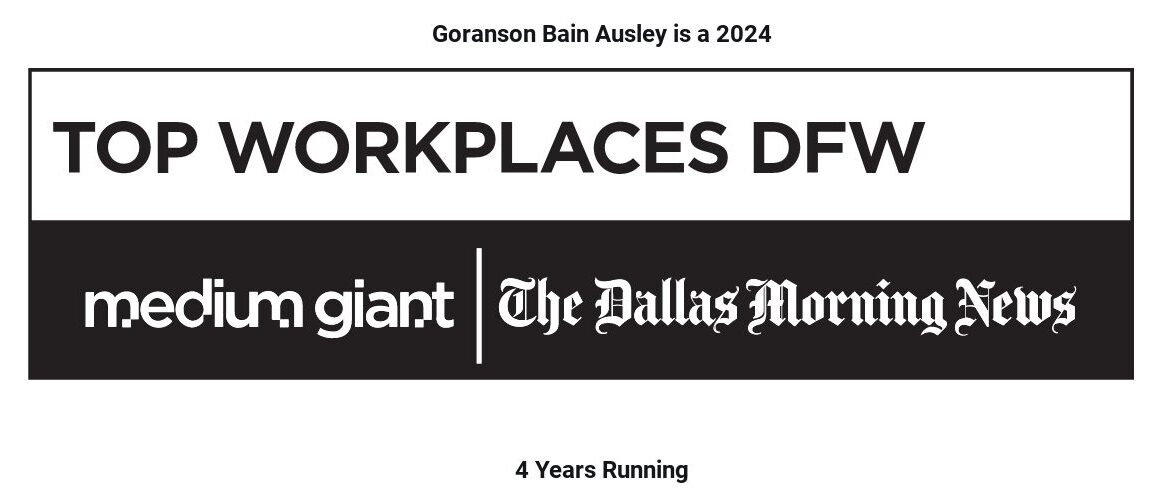 Goranson Bain Ausley has been named a Top Workplace by the Dallas Morning News and recognized as a Best Place to Work by the Dallas Business Journal and Austin Business Journal.